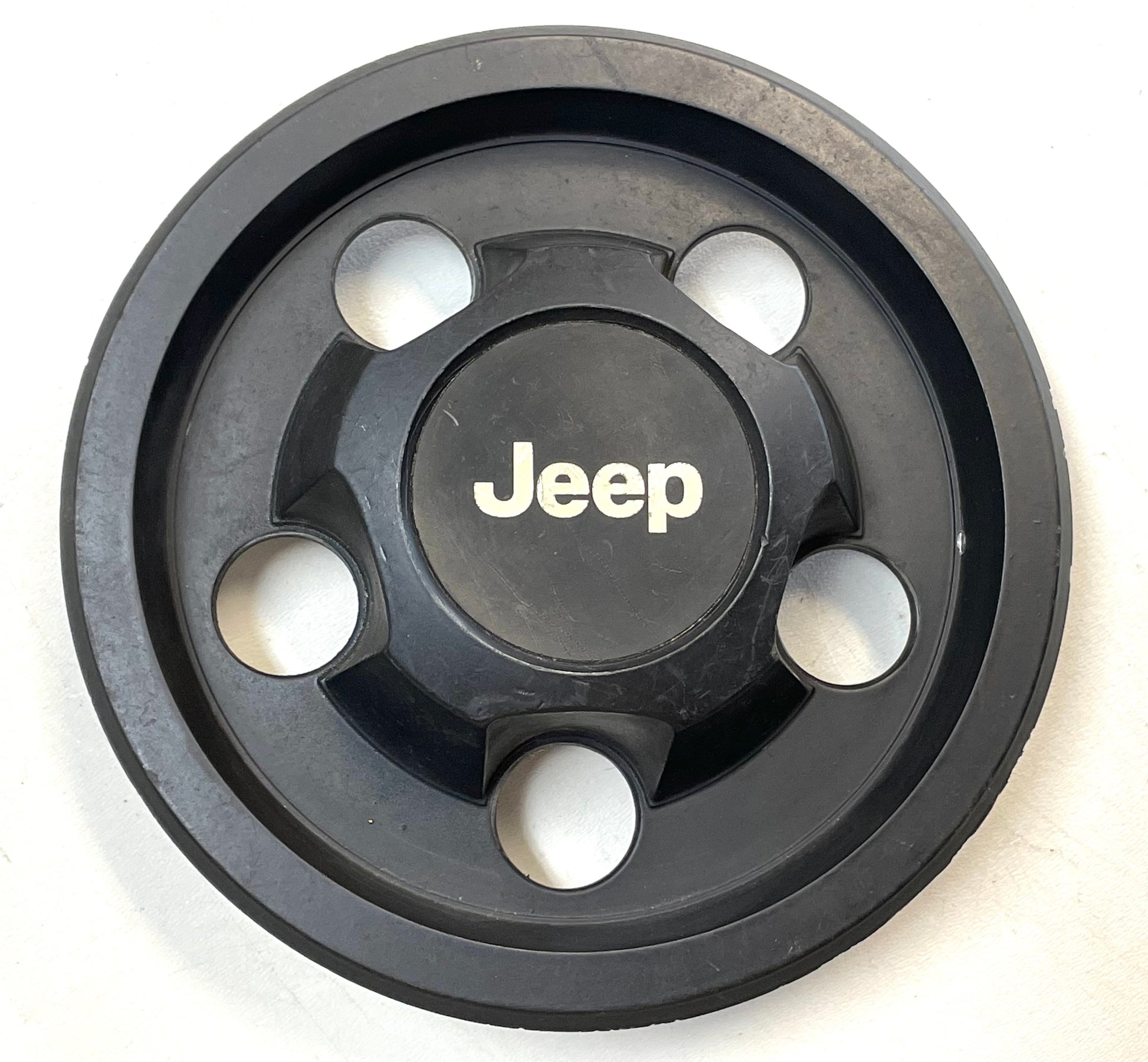 Used Pair of factory wheel center caps fits Jeep XJ Cherokee, YJ Wrangler and TJ Wrangler factory wheels.